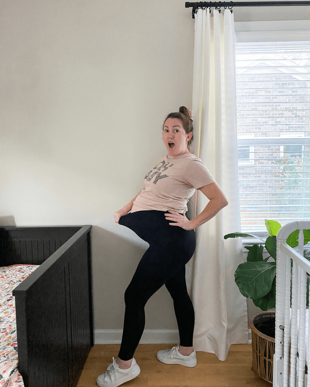 The leggings are designed with an over-the-belly panel that provides gentle back support and stays in place during activities, reducing the need for adjustments.